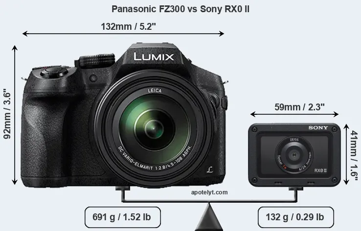 An illustration of the physical size and weight of the Panasonic FZ300 and the Sony RX0 II is provided in the side-by-side display below. The two cameras are presented according to their relative size. Three successive views from the front, the top, and the rear are shown. All width, height and depth measures are rounded to the nearest millimeter.