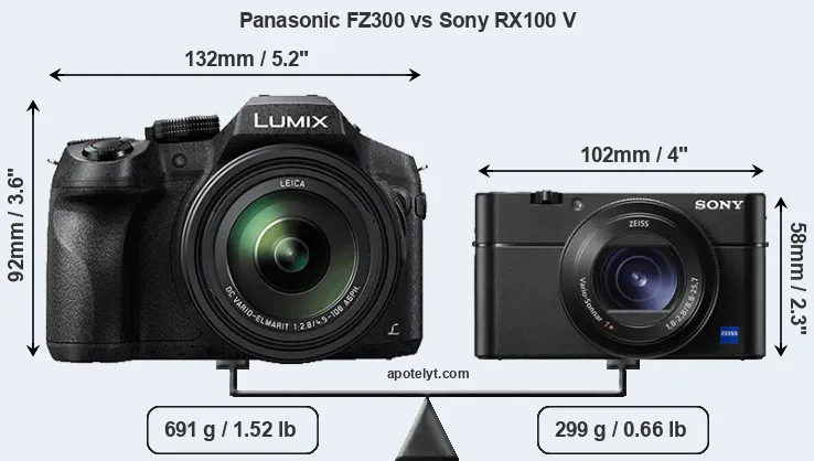 An illustration of the physical size and weight of the Panasonic FZ300 and the Sony RX100 V is provided in the side-by-side display below. The two cameras are presented according to their relative size. Three consecutive perspectives from the front, the top, and the back are available. All size dimensions are rounded to the nearest millimeter.
