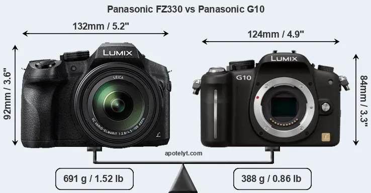 An illustration of the physical size and weight of the Panasonic FZ330 and the Panasonic G10 is provided in the side-by-side display below. The two cameras are presented according to their relative size. Three consecutive perspectives from the front, the top, and the back are available. All size dimensions are rounded to the nearest millimeter.