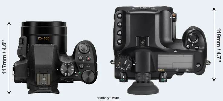 An illustration of the physical size and weight of the Panasonic FZ330 and the Pentax 645D is provided in the side-by-side display below. The two cameras are presented according to their relative size. Three successive views from the front, the top, and the rear are shown. All width, height and depth dimensions are rounded to the nearest millimeter.