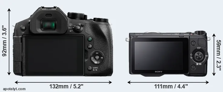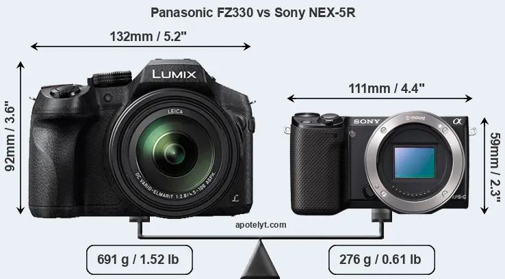 The side-by-side display below illustrates the physical size and weight of the Panasonic FZ330 and the Sony NEX-5R. The two cameras are presented according to their relative size. Three consecutive perspectives from the front, the top, and the back are available. All width, height and depth measures are rounded to the nearest millimeter.