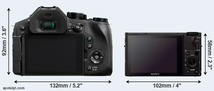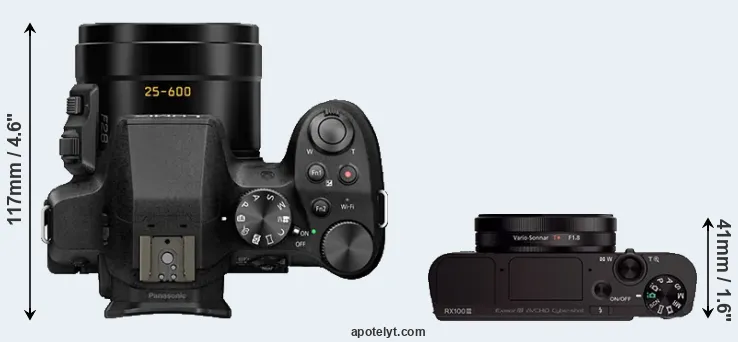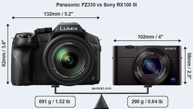 An illustration of the physical size and weight of the Panasonic FZ330 and the Sony RX100 III is provided in the side-by-side display below. The two cameras are presented according to their relative size. Three consecutive perspectives from the front, the top, and the back are available. All size dimensions are rounded to the nearest millimeter.