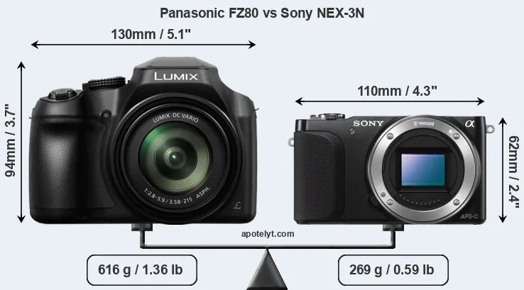 The above size and weight comparisons are to some extent incomplete and possibly misleading, as the FZ80 has a lens built in, whereas the NEX-3N is an interchangeable lens camera that requires a separate lens. Attaching the latter will add extra weight and bulk to the setup. You can compare the optics available for the NEX-3N and their specifications in the Sony E-Mount Lens Catalog.