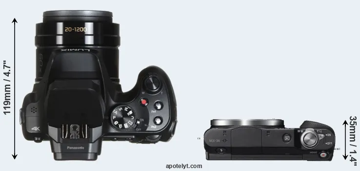The side-by-side display below illustrates the physical size and weight of the Panasonic FZ80 and the Sony NEX-3N. The two cameras are presented according to their relative size. Three consecutive views from the front, the top, and the rear side are shown. All width, height and depth dimensions are rounded to the nearest millimeter.