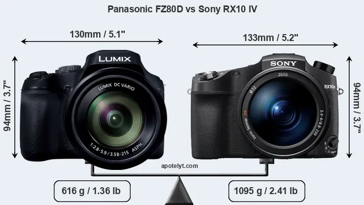 An illustration of the physical size and weight of the Panasonic FZ80D and the Sony RX10 IV is provided in the side-by-side display below. The two cameras are presented according to their relative size. Three consecutive perspectives from the front, the top, and the back are available. All width, height and depth dimensions are rounded to the nearest millimeter.