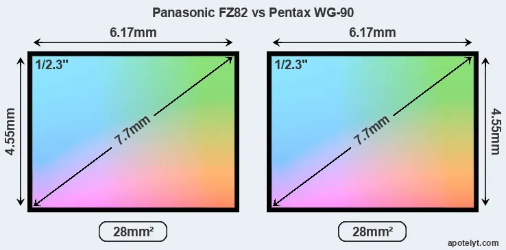 The Panasonic Lumix DC-FZ82 (called Panasonic FZ80 in some regions) and the Pentax WG-90 are two digital cameras that were announced, respectively, in January 2017 and November 2023. Both the FZ82 and the WG-90 are fixed lens compact cameras that are equipped with a 1/2.3-inch sensor. The Panasonic has a resolution of 18 megapixels, whereas the Pentax provides 15.9 MP.