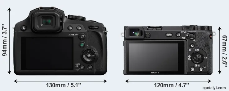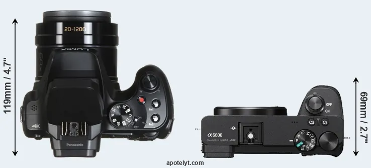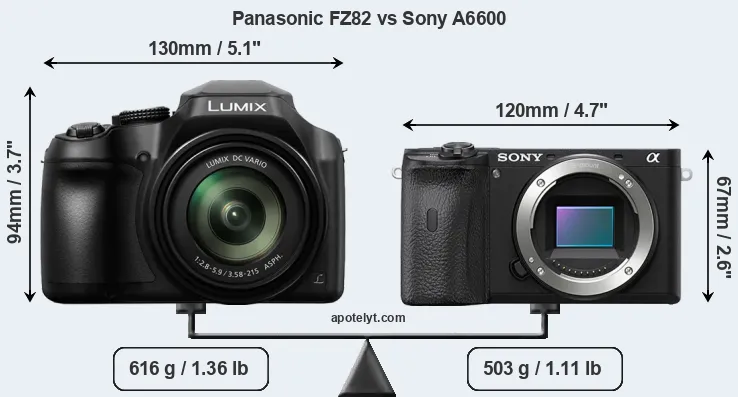The side-by-side display below illustrates the physical size and weight of the Panasonic FZ82 and the Sony A6600. The two cameras are presented according to their relative size. Three consecutive perspectives from the front, the top, and the back are available. All width, height and depth dimensions are rounded to the nearest millimeter.