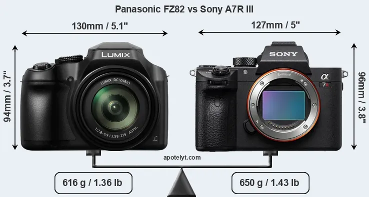 If the front view area (width x height) of the cameras is taken as an aggregate measure of their size, the Panasonic FZ82 and the Sony A7R III are of equal size. It is noteworthy in this context that the A7R III is splash and dust-proof, while the FZ82 does not feature any corresponding weather-sealing.