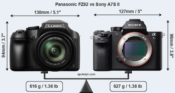 If the front view area (width x height) of the cameras is taken as an aggregate measure of their size, the Panasonic FZ82 and the Sony A7S II are of equal size. It is noteworthy in this context that the A7S II is splash and dust-proof, while the FZ82 does not feature any corresponding weather-sealing.