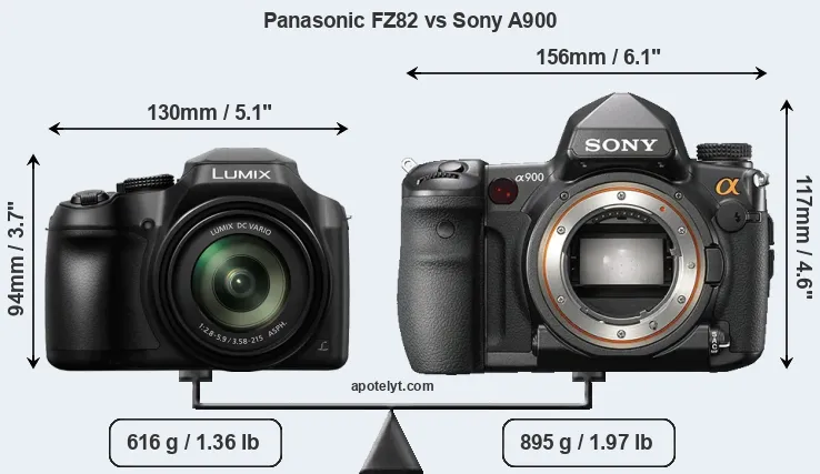 The physical size and weight of the Panasonic FZ82 and the Sony A900 are illustrated in the side-by-side display below. The two cameras are presented according to their relative size. Three consecutive perspectives from the front, the top, and the back are available. All width, height and depth measures are rounded to the nearest millimeter.