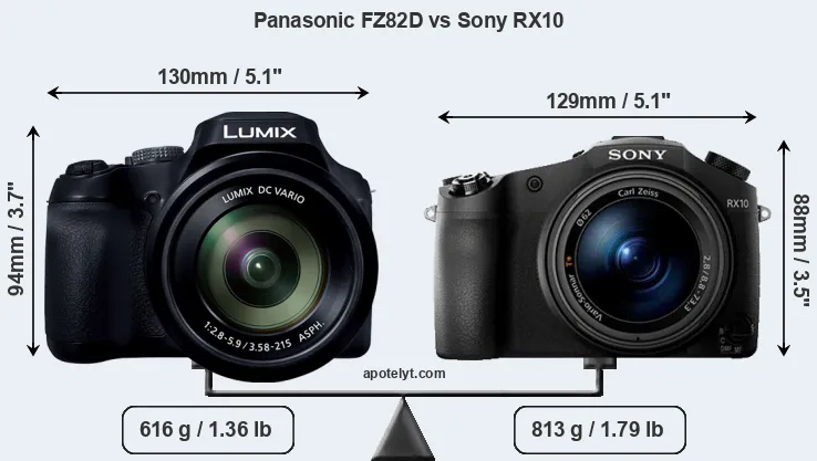The side-by-side display below illustrates the physical size and weight of the Panasonic FZ82D and the Sony RX10. The two cameras are presented according to their relative size. Three consecutive perspectives from the front, the top, and the back are available. All size dimensions are rounded to the nearest millimeter.