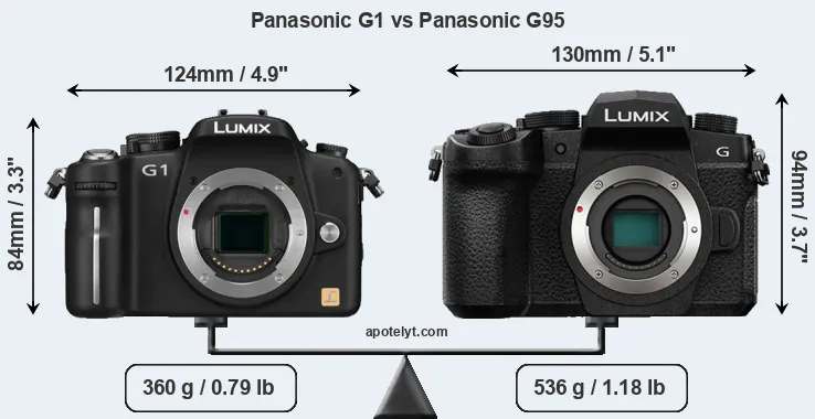 If the front view area (width x height) of the cameras is taken as an aggregate measure of their size, the Panasonic G95 is notably larger (17 percent) than the Panasonic G1. Moreover, the G95 is substantially heavier (49 percent) than the G1. It is noteworthy in this context that the G95 is splash and dust-proof, while the G1 does not feature any corresponding weather-sealing.