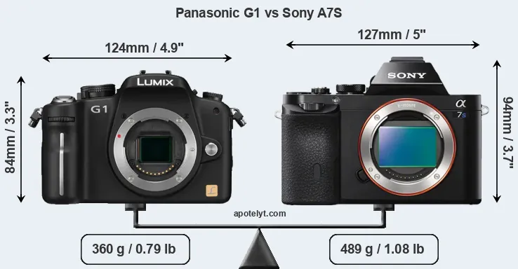 If the front view area (width x height) of the cameras is taken as an aggregate measure of their size, the Sony A7S is notably larger (15 percent) than the Panasonic G1. Moreover, the A7S is substantially heavier (36 percent) than the G1. It is noteworthy in this context that the A7S is splash and dust-proof, while the G1 does not feature any corresponding weather-sealing.