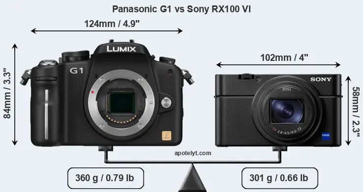 An illustration of the physical size and weight of the Panasonic G1 and the Sony RX100 VI is provided in the side-by-side display below. The two cameras are presented according to their relative size. Three consecutive views from the front, the top, and the rear side are shown. All width, height and depth measures are rounded to the nearest millimeter.