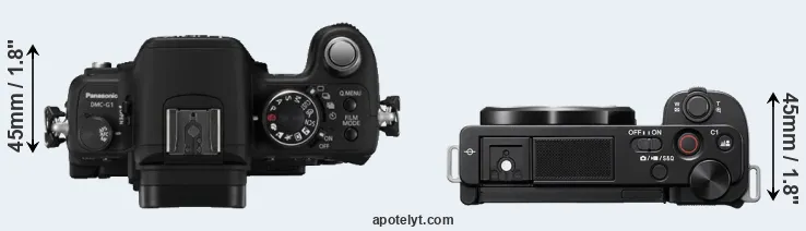 The side-by-side display below illustrates the physical size and weight of the Panasonic G1 and the Sony ZV-E10. The two cameras are presented according to their relative size. Three consecutive views from the front, the top, and the rear side are shown. All width, height and depth dimensions are rounded to the nearest millimeter.