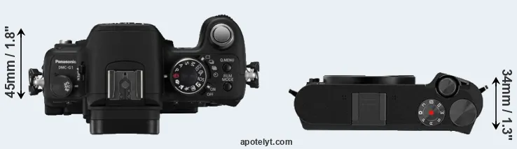 An illustration of the physical size and weight of the Panasonic G1 and the YI M1 is provided in the side-by-side display below. The two cameras are presented according to their relative size. Three consecutive views from the front, the top, and the rear side are shown. All width, height and depth dimensions are rounded to the nearest millimeter.
