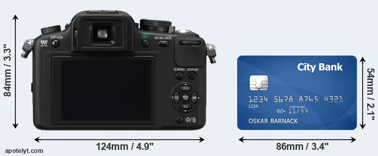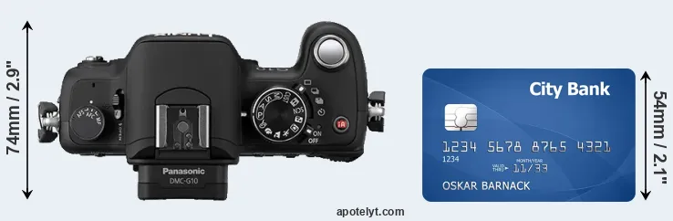 An illustration of the physical dimensions of the Panasonic G10 vis-à-vis a credit card is provided in the side-by-side display below. Three consecutive views from the front, the top, and the rear side are shown. All width, height and depth dimensions are rounded to the nearest millimeter.