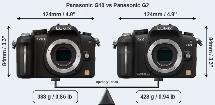 In this particular case, the Panasonic G10 and the Panasonic G2 have exactly the same width and height, and, thus, have identically-sized bodies. However, the G2 is markedly heavier (10 percent) than the G10. In this context, it is worth noting that neither the G10 nor the G2 are weather-sealed.