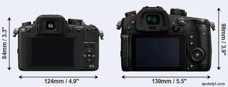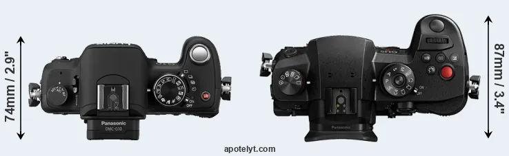 The side-by-side display below illustrates the physical size and weight of the Panasonic G10 and the Panasonic GH5 II. The two cameras are presented according to their relative size. Three consecutive views from the front, the top, and the rear side are shown. All width, height and depth dimensions are rounded to the nearest millimeter.