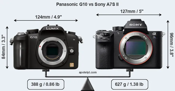 If the front view area (width x height) of the cameras is taken as an aggregate measure of their size, the Sony A7S II is notably larger (17 percent) than the Panasonic G10. Moreover, the A7S II is substantially heavier (62 percent) than the G10. It is noteworthy in this context that the A7S II is splash and dust-proof, while the G10 does not feature any corresponding weather-sealing.