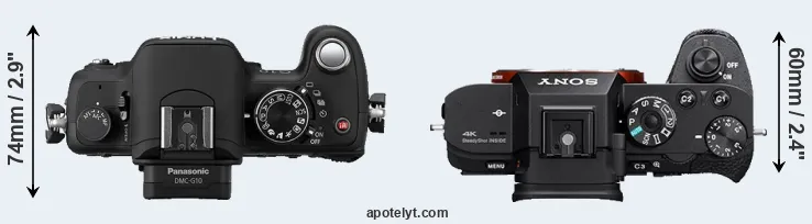 The physical size and weight of the Panasonic G10 and the Sony A7S II are illustrated in the side-by-side display below. The two cameras are presented according to their relative size. Three consecutive views from the front, the top, and the rear side are shown. All width, height and depth dimensions are rounded to the nearest millimeter.