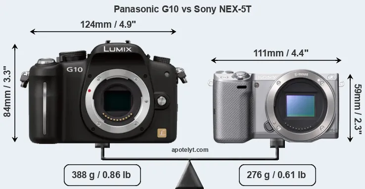 If the front view area (width x height) of the cameras is taken as an aggregate measure of their size, the Sony NEX-5T is considerably smaller (37 percent) than the Panasonic G10. Moreover, the NEX-5T is markedly lighter (29 percent) than the G10. In this context, it is worth noting that neither the G10 nor the NEX-5T are weather-sealed.