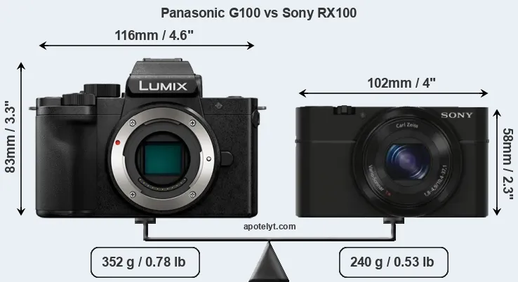 An illustration of the physical size and weight of the Panasonic G100 and the Sony RX100 is provided in the side-by-side display below. The two cameras are presented according to their relative size. Three successive views from the front, the top, and the rear are shown. All width, height and depth measures are rounded to the nearest millimeter.