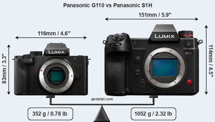 If the front view area (width x height) of the cameras is taken as an aggregate measure of their size, the Panasonic S1H is considerably larger (79 percent) than the Panasonic G110. Moreover, the S1H is substantially heavier (199 percent) than the G110. It is noteworthy in this context that the S1H is splash and dust-proof, while the G110 does not feature any corresponding weather-sealing.