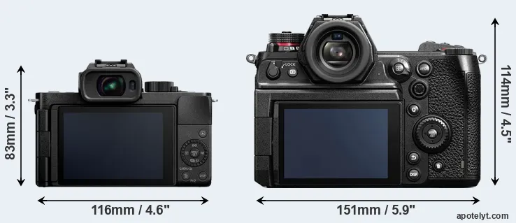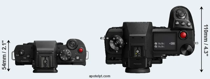 The physical size and weight of the Panasonic G110 and the Panasonic S1H are illustrated in the side-by-side display below. The two cameras are presented according to their relative size. Three successive views from the front, the top, and the rear are shown. All width, height and depth measures are rounded to the nearest millimeter.