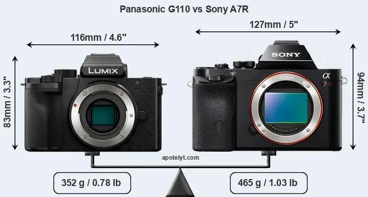 If the front view area (width x height) of the cameras is taken as an aggregate measure of their size, the Sony A7R is notably larger (24 percent) than the Panasonic G110. Moreover, the A7R is markedly heavier (32 percent) than the G110. It is noteworthy in this context that the A7R is splash and dust-proof, while the G110 does not feature any corresponding weather-sealing.
