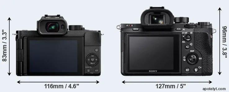 The physical size and weight of the Panasonic G110 and the Sony A7R II are illustrated in the side-by-side display below. The two cameras are presented according to their relative size. Three successive views from the front, the top, and the rear are shown. All size dimensions are rounded to the nearest millimeter.