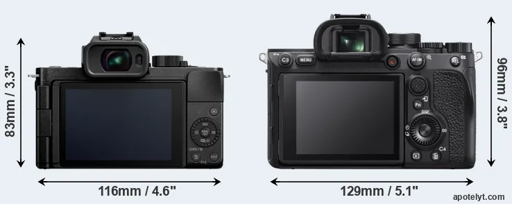 The physical size and weight of the Panasonic G110 and the Sony A7R IVA are illustrated in the side-by-side display below. The two cameras are presented according to their relative size. Three successive views from the front, the top, and the rear are shown. All width, height and depth measures are rounded to the nearest millimeter.