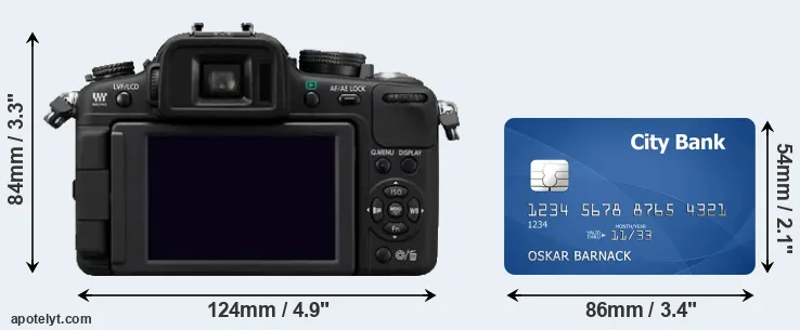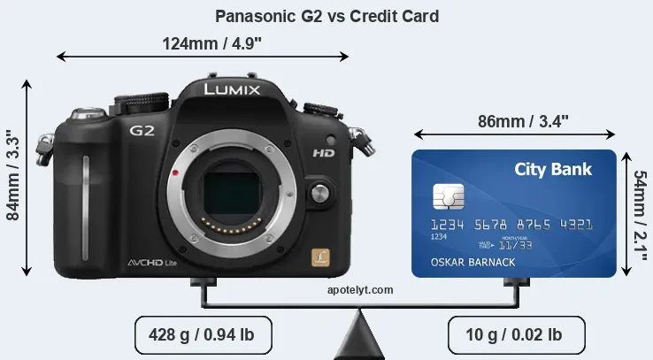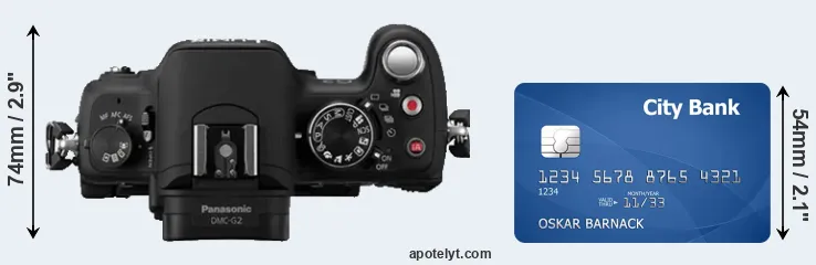 An illustration of the physical dimensions of the Panasonic G2 vis-à-vis a credit card is provided in the side-by-side display below. Three consecutive views from the front, the top, and the rear side are shown. All width, height and depth dimensions are rounded to the nearest millimeter.