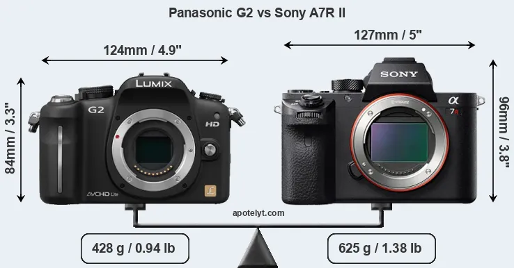 An illustration of the physical size and weight of the Panasonic G2 and the Sony A7R II is provided in the side-by-side display below. The two cameras are presented according to their relative size. Three successive views from the front, the top, and the rear are shown. All size dimensions are rounded to the nearest millimeter.