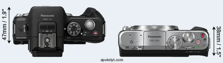 An illustration of the physical size and weight of the Panasonic G3 and the Panasonic GF6 is provided in the side-by-side display below. The two cameras are presented according to their relative size. Three consecutive perspectives from the front, the top, and the back are available. All width, height and depth dimensions are rounded to the nearest millimeter.
