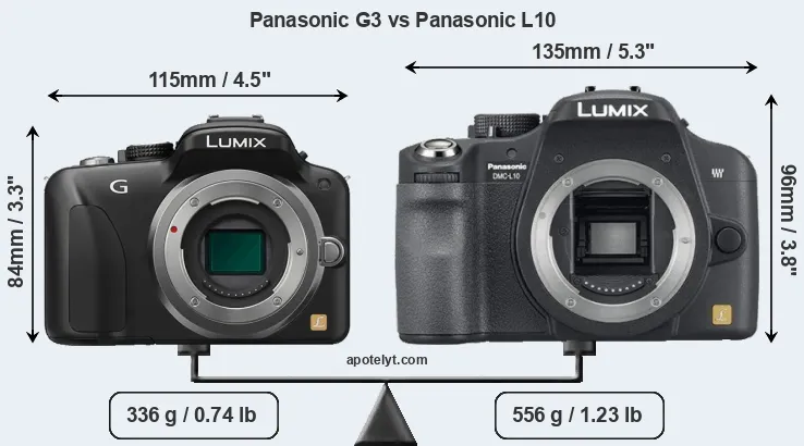 The physical size and weight of the Panasonic G3 and the Panasonic L10 are illustrated in the side-by-side display below. The two cameras are presented according to their relative size. Three consecutive perspectives from the front, the top, and the back are available. All width, height and depth dimensions are rounded to the nearest millimeter.