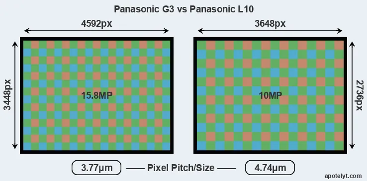 While the two cameras under review share the same sensor size, the G3 offers a higher resolution of 15.8 megapixels, compared with 10 MP of the L10. This megapixels advantage translates into a 26 percent gain in linear resolution. On the other hand, these sensor specs imply that the G3 has a higher pixel density and a smaller size of the individual pixel (with a pixel pitch of 3.77μm versus 4.74μm for the L10). In this context, it should be noted, however, that the G3 is much more recent (by 3 years and 8 months) than the L10, and its sensor will have benefitted from technological advances during this time that compensate for the smaller pixel size.