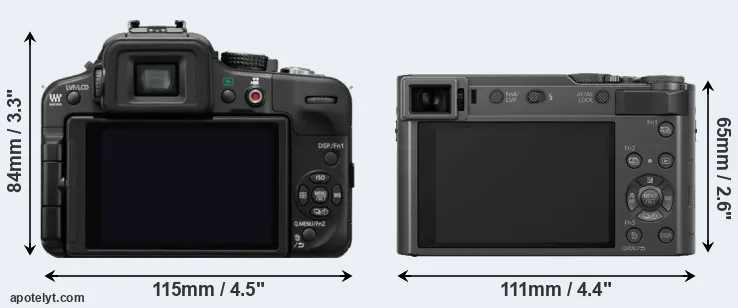The side-by-side display below illustrates the physical size and weight of the Panasonic G3 and the Panasonic TZ200. The two cameras are presented according to their relative size. Three consecutive perspectives from the front, the top, and the back are available. All size dimensions are rounded to the nearest millimeter.