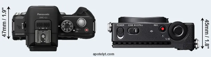 An illustration of the physical size and weight of the Panasonic G3 and the Sigma fp is provided in the side-by-side display below. The two cameras are presented according to their relative size. Three consecutive views from the front, the top, and the rear side are shown. All width, height and depth measures are rounded to the nearest millimeter.
