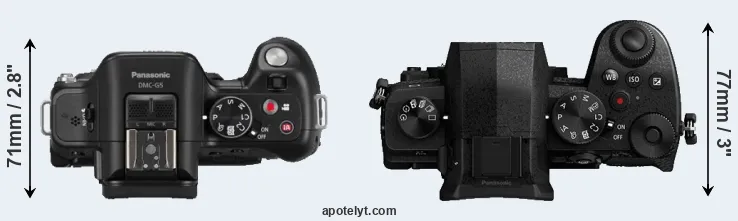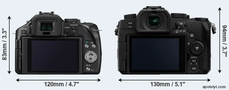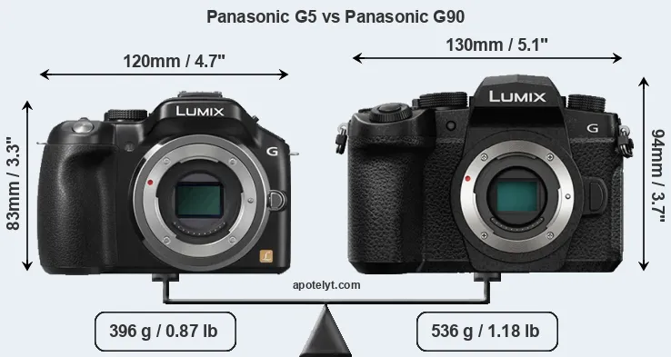 The side-by-side display below illustrates the physical size and weight of the Panasonic G5 and the Panasonic G90. The two cameras are presented according to their relative size. Three consecutive perspectives from the front, the top, and the back are available. All width, height and depth measures are rounded to the nearest millimeter.