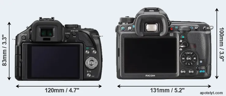 The physical size and weight of the Panasonic G5 and the Pentax K-3 are illustrated in the side-by-side display below. The two cameras are presented according to their relative size. Three consecutive perspectives from the front, the top, and the back are available. All width, height and depth dimensions are rounded to the nearest millimeter.