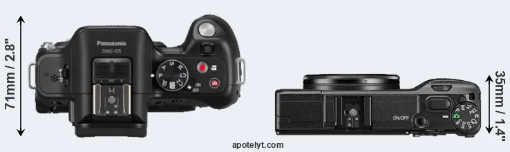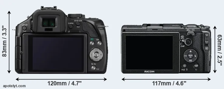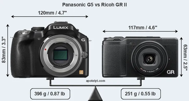 The physical size and weight of the Panasonic G5 and the Ricoh GR II are illustrated in the side-by-side display below. The two cameras are presented according to their relative size. Three successive views from the front, the top, and the rear are shown. All width, height and depth dimensions are rounded to the nearest millimeter.