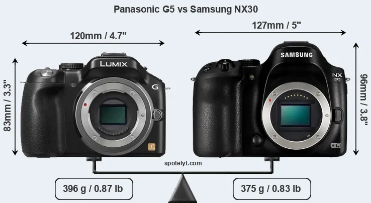 If the front view area (width x height) of the cameras is taken as an aggregate measure of their size, the Samsung NX30 is notably larger (22 percent) than the Panasonic G5. However, the NX30 is markedly lighter (5 percent) than the G5. In this context, it is worth noting that neither the G5 nor the NX30 are weather-sealed.