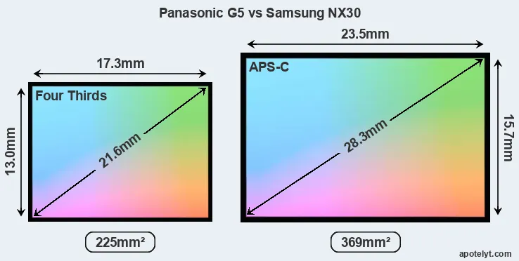 Of the two cameras under consideration, the Panasonic G5 features a Four Thirds sensor and the Samsung NX30 an APS-C sensor. The sensor area in the NX30 is 64 percent bigger. As a result of these sensor size differences, the cameras have a format factor of, respectively, 2.0 and 1.5. The sensor in the G5 has a native 4:3 aspect ratio, while the one in the NX30 offers a 3:2 aspect.