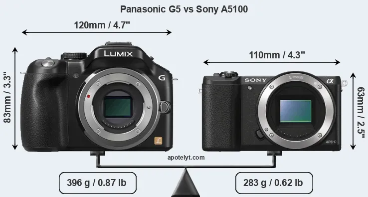 If the front view area (width x height) of the cameras is taken as an aggregate measure of their size, the Sony A5100 is considerably smaller (30 percent) than the Panasonic G5. Moreover, the A5100 is markedly lighter (29 percent) than the G5. In this context, it is worth noting that neither the G5 nor the A5100 are weather-sealed.