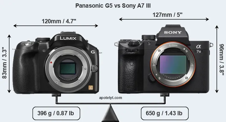 If the front view area (width x height) of the cameras is taken as an aggregate measure of their size, the Sony A7 III is notably larger (22 percent) than the Panasonic G5. Moreover, the A7 III is substantially heavier (64 percent) than the G5. It is noteworthy in this context that the A7 III is splash and dust-proof, while the G5 does not feature any corresponding weather-sealing.