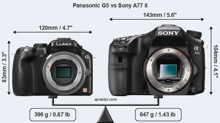 If the front view area (width x height) of the cameras is taken as an aggregate measure of their size, the Sony A77 II is considerably larger (49 percent) than the Panasonic G5. Moreover, the A77 II is substantially heavier (63 percent) than the G5. It is noteworthy in this context that the A77 II is splash and dust-proof, while the G5 does not feature any corresponding weather-sealing.