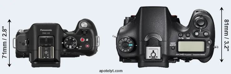 The side-by-side display below illustrates the physical size and weight of the Panasonic G5 and the Sony A77 II. The two cameras are presented according to their relative size. Three successive views from the front, the top, and the rear are shown. All width, height and depth dimensions are rounded to the nearest millimeter.