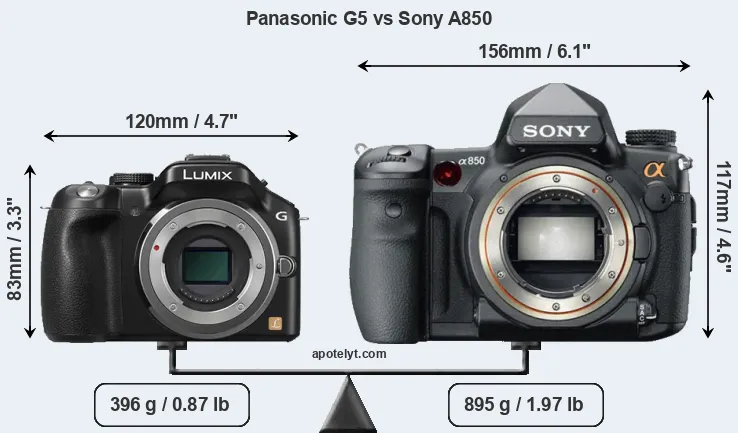 If the front view area (width x height) of the cameras is taken as an aggregate measure of their size, the Sony A850 is considerably larger (83 percent) than the Panasonic G5. Moreover, the A850 is substantially heavier (126 percent) than the G5. It is noteworthy in this context that the A850 is splash and dust-proof, while the G5 does not feature any corresponding weather-sealing.