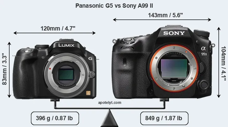 If the front view area (width x height) of the cameras is taken as an aggregate measure of their size, the Sony A99 II is considerably larger (49 percent) than the Panasonic G5. Moreover, the A99 II is substantially heavier (114 percent) than the G5. It is noteworthy in this context that the A99 II is splash and dust-proof, while the G5 does not feature any corresponding weather-sealing.